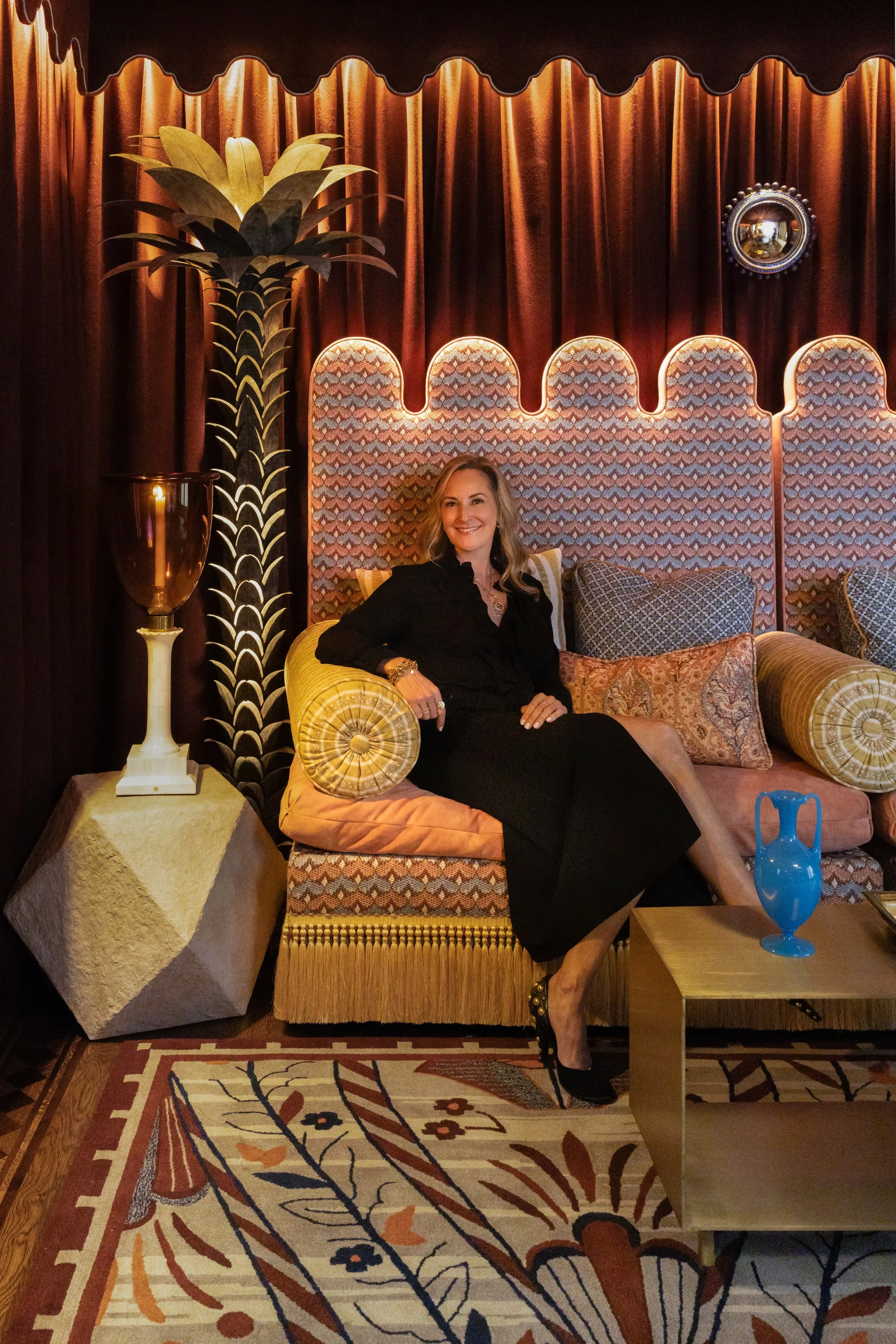 Interior designer Julie Rootes transformed the dining room into an interior inspired by Marrakech's luxury hotels and Oriental culture. The walls and ceiling are covered entirely with alpaca wool fabric, creating the impression of a tent.