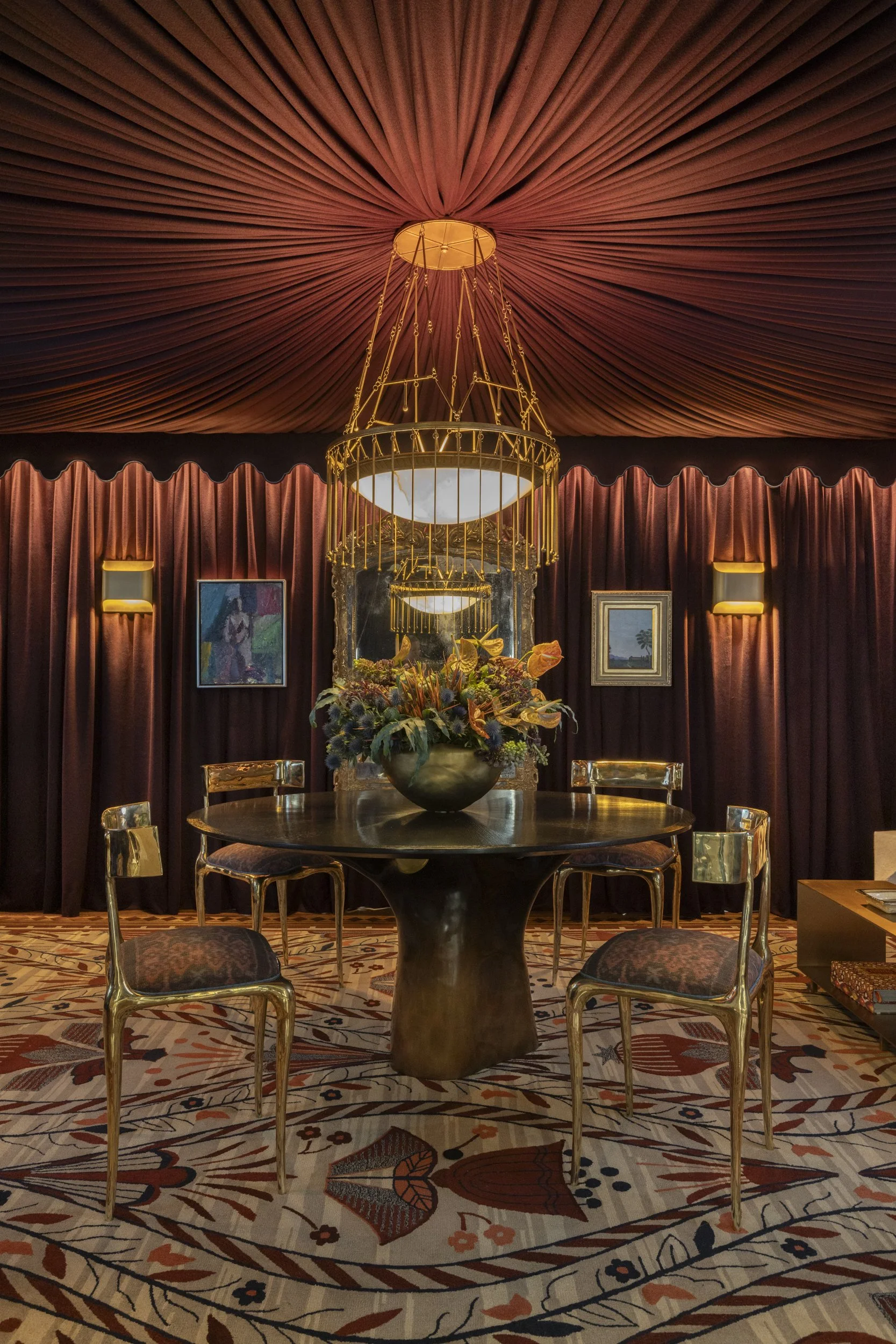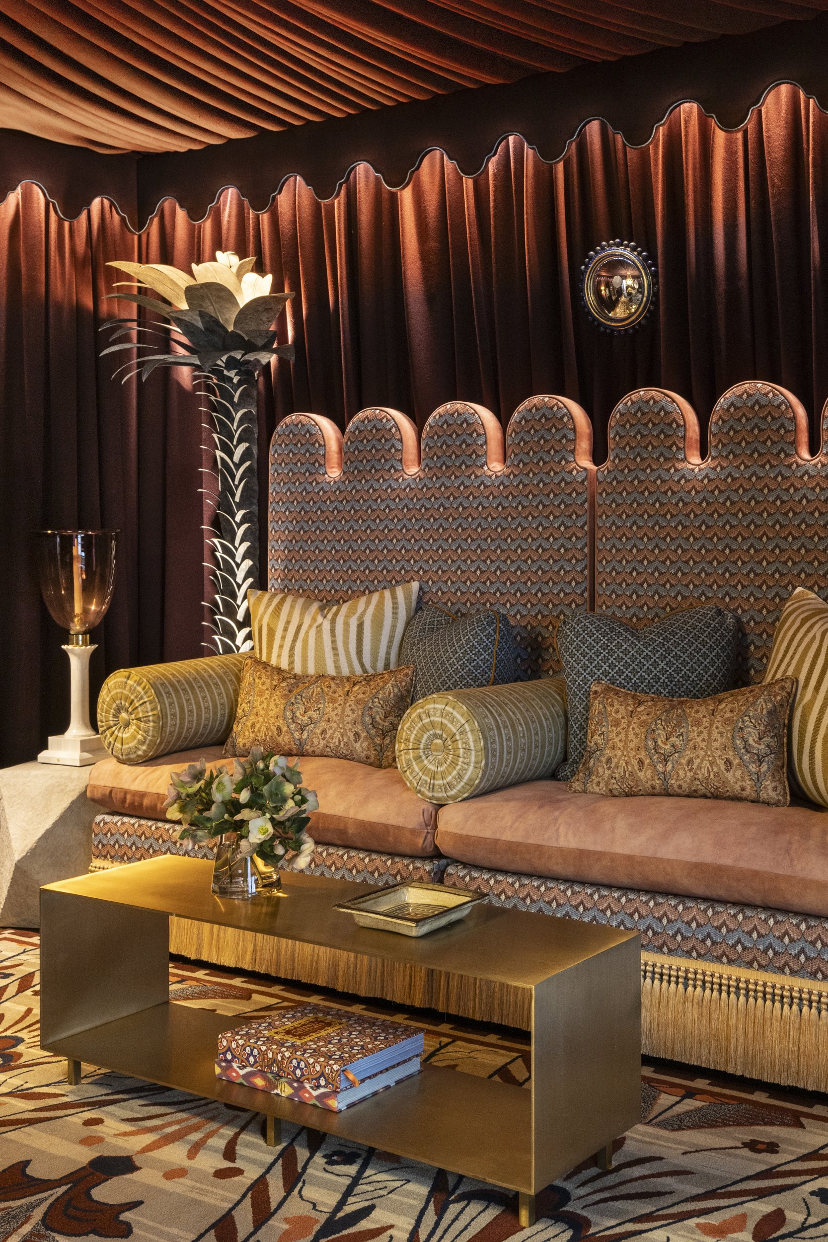 Sandra Jordan’s Aubergine Prima Alpaca tented the ceiling and draped the walls of Julie Rootes’ dining room. The Mongiardino-esque ambiance continued with Paul Ferrante’s jewelry-like hanging light fixture. Its alabaster bowl casts an evocative glow on diners seated at an organically shaped table surrounded by John Lyle’s solid bronze dining chairs. A mid-18th-century French Baroque giltwood mirror from Garden Court Antiques adds dimension. Guests adjourn to the Moroccan-style divan upholstered in Pierre Frey and Casamance fabrics and embellished with Houles trim.